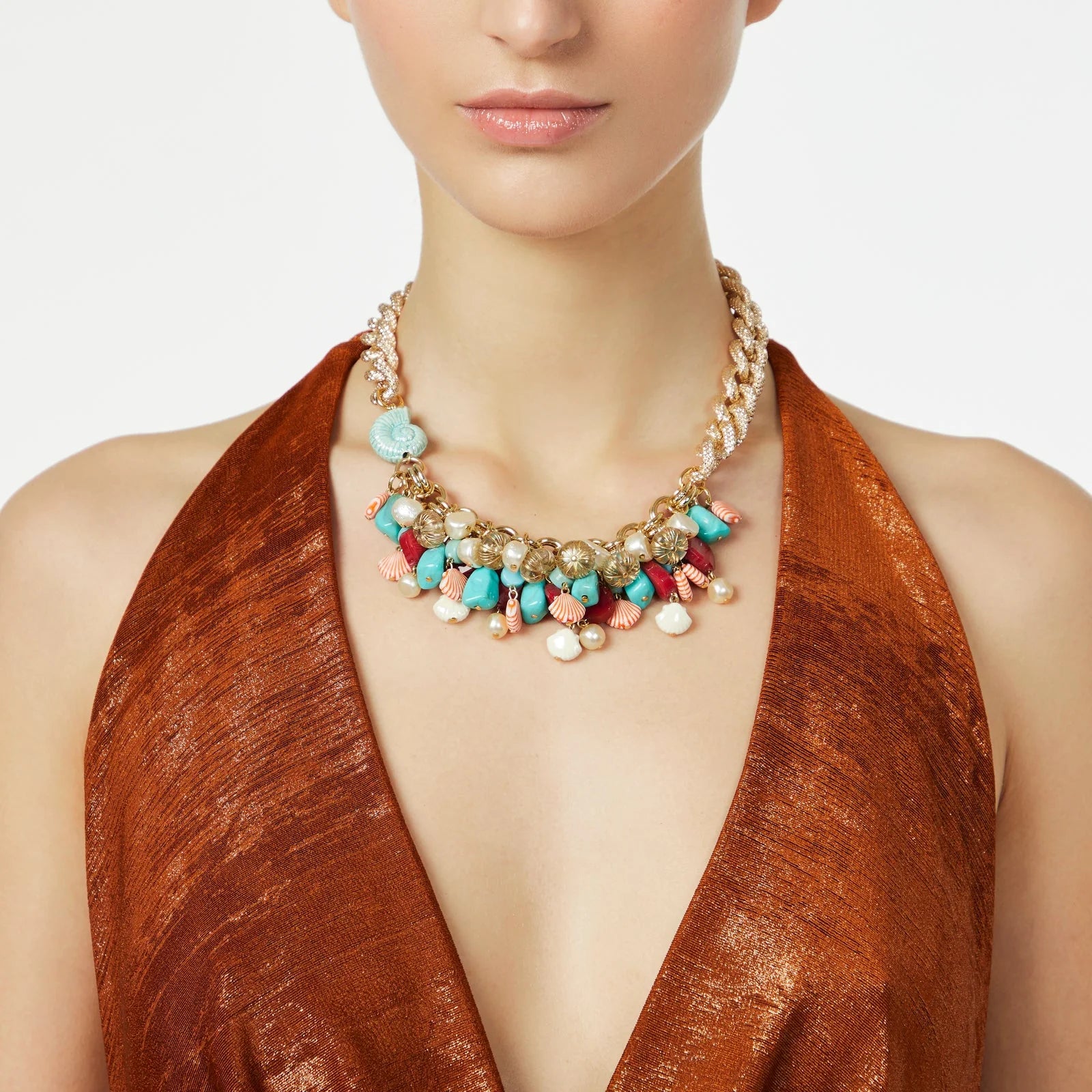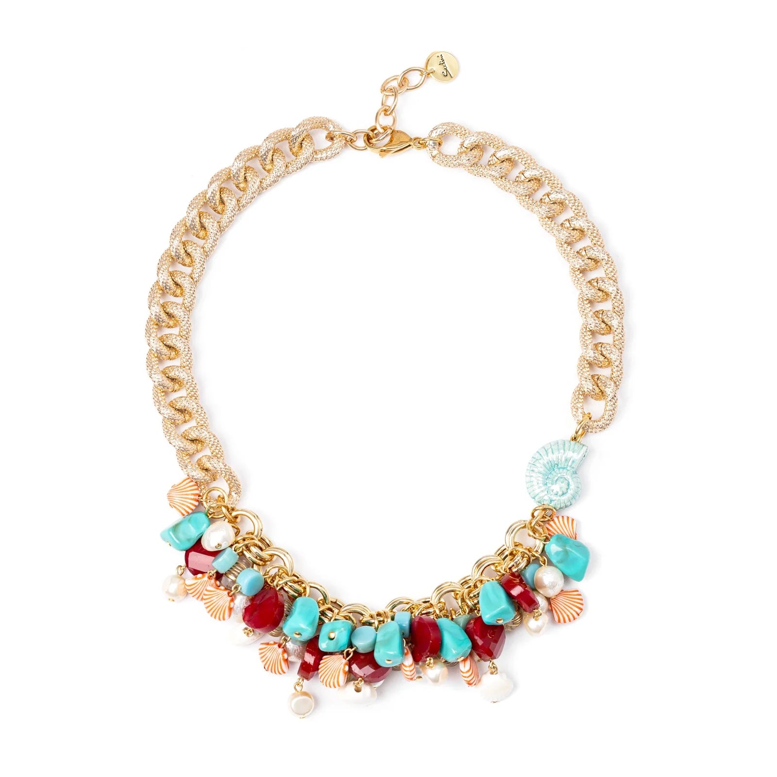 Esuberante e di gran moda questa collana corta aggiunge un tocco giovane e raffinato su qualsiasi mise. Design brioso con splendente catena groumette a grandi maglie che incontra una serie di anelli concatenati che sorreggono numerosi piccoli pendenti dalle vivaci cromie del mare. Un accessorio perfetto in qualsiasi occasione, nelle sue tonalità multicolore e oro.
