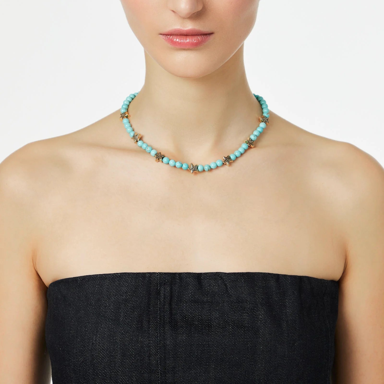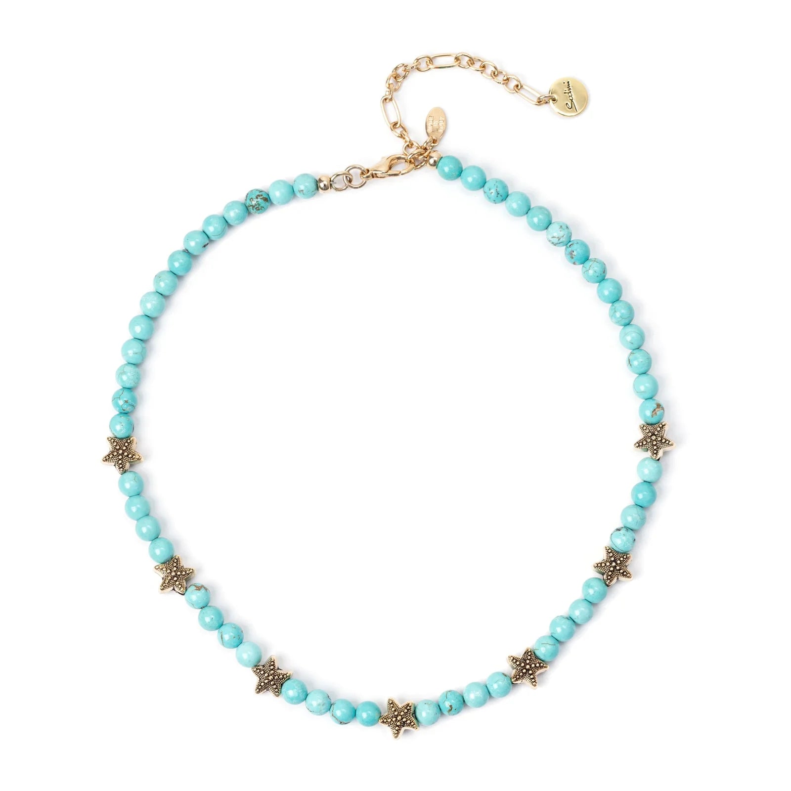 Design con un filo di luminose boule di diaspro che si alternano a delicate piccole stelle marine, per un unicum fresco e accattivante. Un accessorio dall'accento mediterraneo nelle sue cromie del turchese e oro, perfetto con qualsiasi outfit.