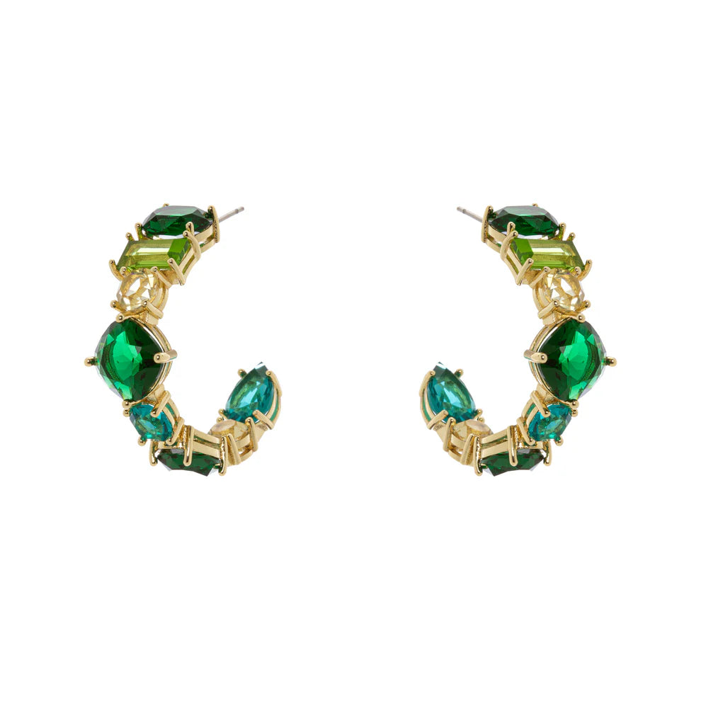 Eleganza e colore si incontrano in questi splendidi orecchini a cerchio della linea Jaqueline by Sodini. Realizzati in ottone dorato e impreziositi da cristalli K3 nelle affascinanti tonalità del verde smeraldo, lime e turchese, donano luce e personalità al volto. La composizione geometrica dei cristalli, con tagli diversi e riflessi vibranti, crea un effetto dinamico e sofisticato, perfetto per completare look sia da giorno che da sera.