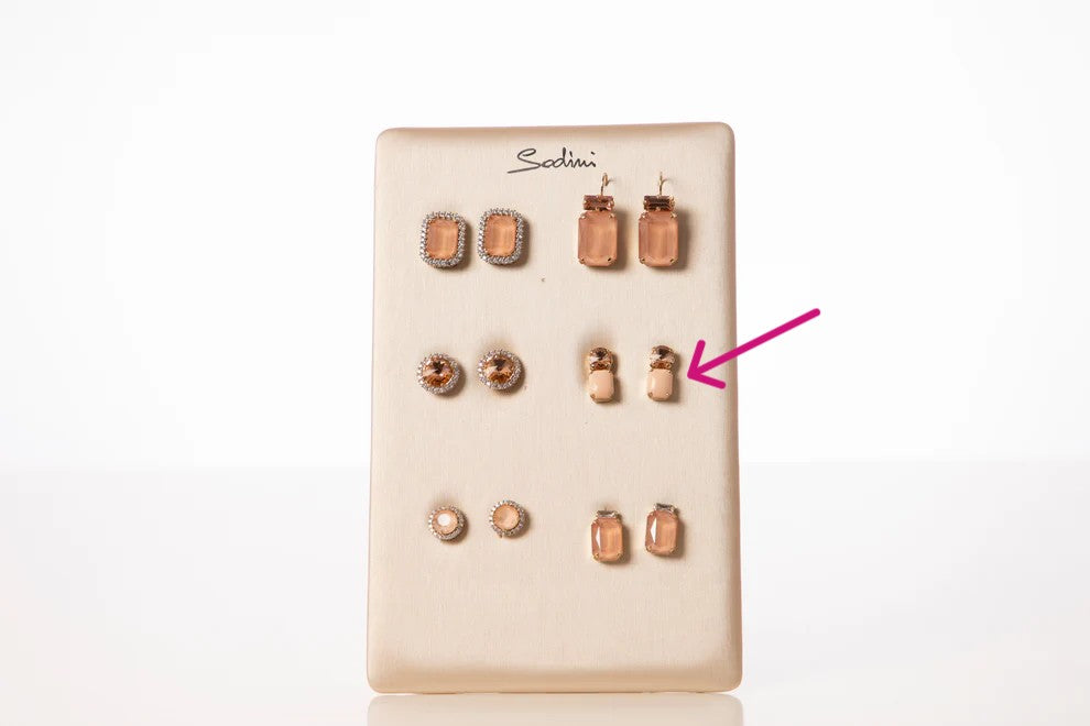 Questi eleganti orecchini della collezione Faville di Sodini sono perfetti per chi ama un tocco di classe e raffinatezza. Il design sofisticato presenta una pietra rettangolare color cipria, sormontata da una gemma più piccola e luminosa, creando un effetto di grande fascino.
